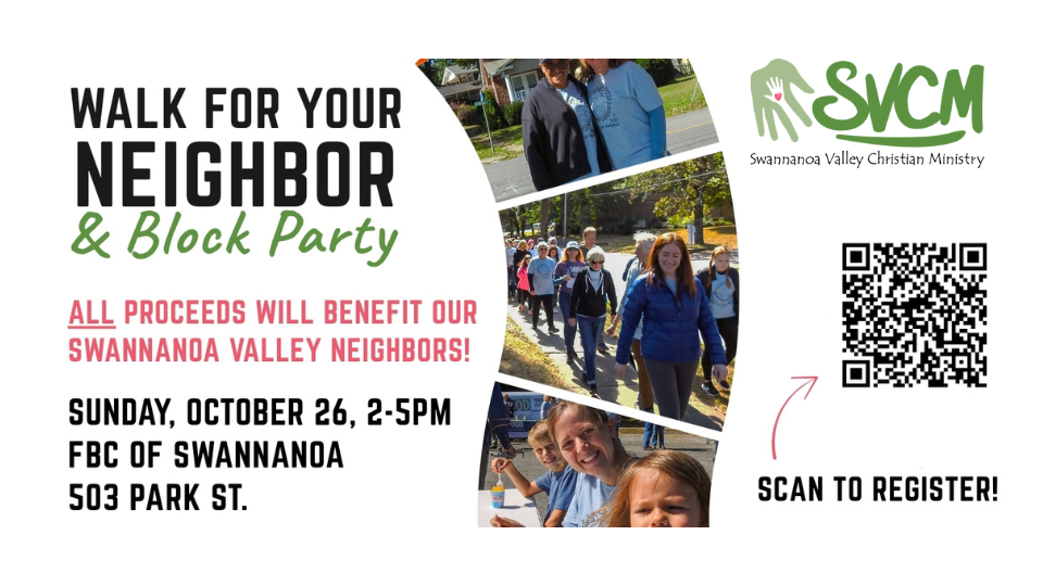 After being cancelled last year due to Hurricane Helene, our annual fundraiser Walk For Your Neighbor is BACK! Please join us on Sunday, October 26 at First Baptist Church of ***Swannanoa*** for a walk and block party! We’re still sorting out a few details, but there will be music, as well as food and drink! The walk will start at 2pm, with the block party continuing until 5pm. To add to the excitement, this day will also coincide with the 1-year anniversary of our NeighborCare Clinic! To register for Walk for Your Neighbor, just click this link: Walk for Your Neighbor 2025. Registration is by donation only, but we are encouraging a $20 minimum donation for those who are able. You can also ask family and friends to sponsor your walk using the donation link you receive when you register. To be cost and environmentally conscious, we will be using last year's event t-shirts.